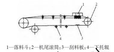 對于帶式輸送機來說,其落料斗通常設置在機尾位置,如下圖所示,當物料下落后,由輸送帶運送至機頭,在這個過程中,由于矸石等雜質的存在,在物料通過漏斗時,一旦矸石過大,則矸石會卡在漏斗壁與輸送帶之間,由于輸送帶運行速度的原因,在短時間內輸送帶就會發生斷裂,因此要想防止輸送帶發生早期破壞,則應該對落料漏斗進行改造。