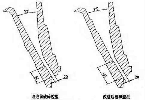 改進后破碎腔嚙角由22°變?yōu)?6°,嚙角的減小可以夾住較大石料,防止破碎時石料往上跳,這樣破碎腔中石料填充率提高,形成層壓破碎,減少產(chǎn)品石料針片狀含量,優(yōu)化產(chǎn)品粒度。理論上,如果嚙合角過大,礦石在破碎腔內(nèi)容易打滑,生產(chǎn)能力降低,同時增加了襯板的磨損和電能消耗;如果嚙合角過小,將導致破碎腔過小,容納的礦石量相對減小,對產(chǎn)量造成影響,同時會增 加設(shè)備的制造費用和機器的高度。
