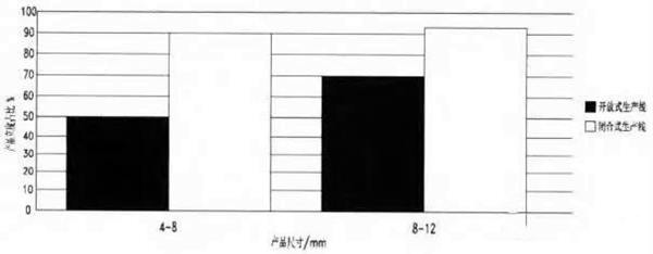 由圖3可得閉合式生產(chǎn)線所生產(chǎn)的產(chǎn)品粒度占比遠遠高于開放式生產(chǎn)線。原因是不合格的返料多次破碎,成品形狀更好,特別是細料產(chǎn)品更突出。